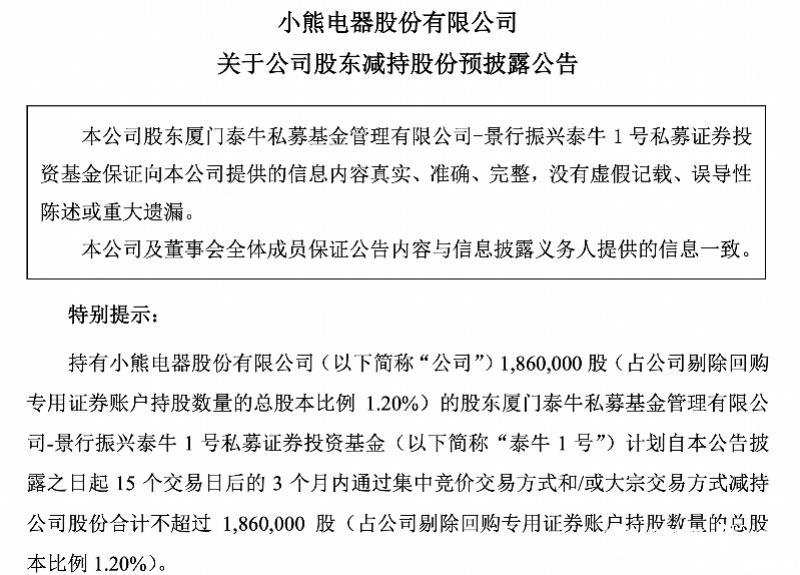 值得一提的是,小熊电器还走漏了鼓动减执的公告——2025年1月14日,小熊电器公告称,公司鼓动门泰牛私募基金搞定有限公司-景行振兴泰牛1号私募证券投资基金(简称“泰牛1号”)决策通过结合竞价来往情势和/或大量来往情势减执公司股份揣度不跳跃186万股,占公司剔除回购专用证券账户执股数目的总股本比例1.20%。按照2024年3季报,泰牛1号执有小熊电器股票186万股,占比1.19%,这也意味着泰牛1号将清仓小熊电器股票。